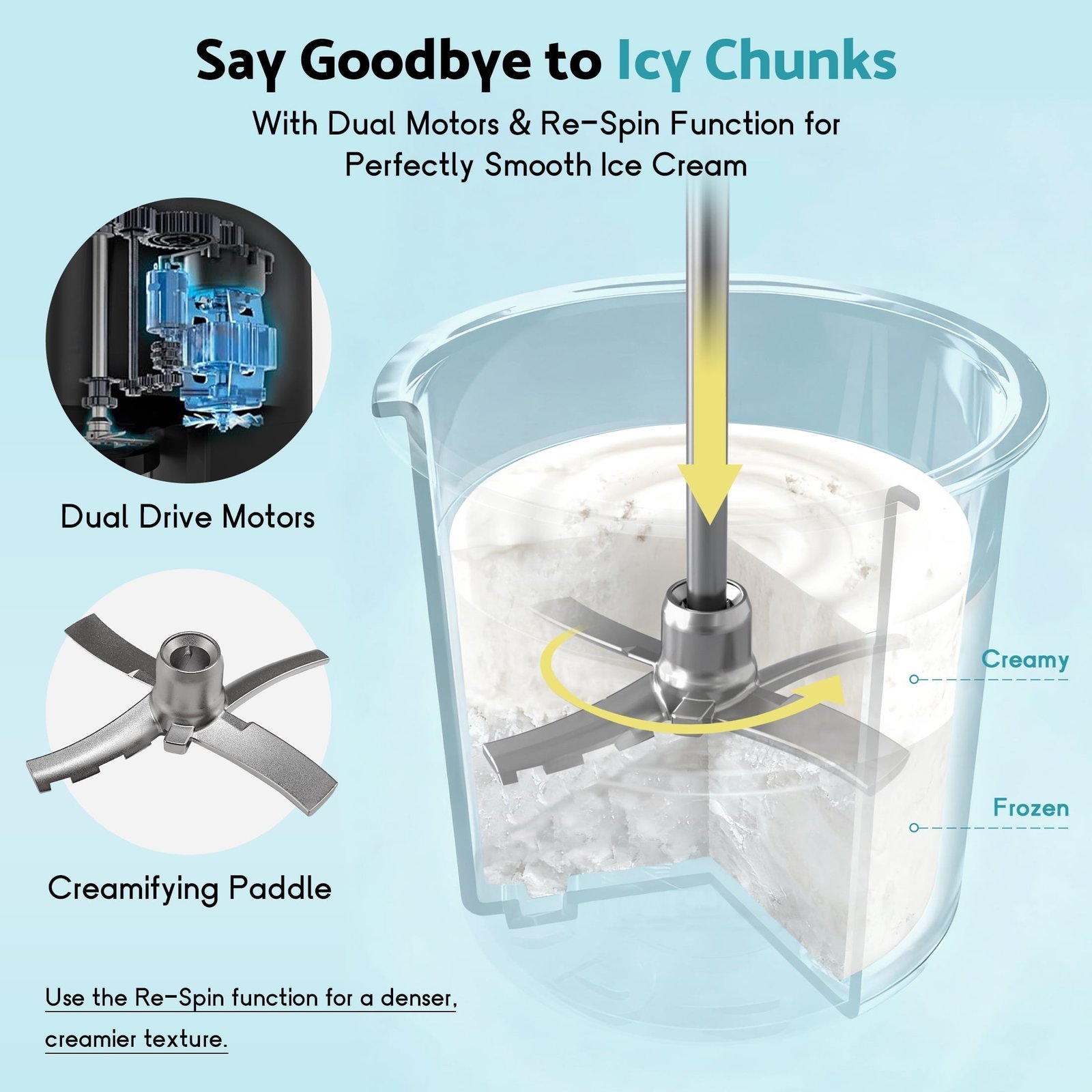 Just freeze your base for 24 hours, choose a program, and enjoy in minutes. The dual-motor system with Creamifying Paddle turns frozen bases into smooth desserts, while the Mix-in function blends toppings evenly throughout. Includes self-cleaning and two 16-oz containers.